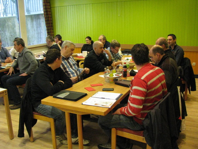 genannte "Einsatzsimulationen". Es handelt sich hierbei um eine sehr effektive Art der Führungsausbildung. Obwohl alle Einheiten, Fahrzeuge und Geräte nur als Magnetbilder auf einer großen